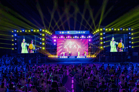 喬樂隊(duì)、達(dá)令樂隊(duì)、摩登樂隊(duì)……安徽知名樂隊(duì)相繼登場,將搖滾、流行、民俗、電音等多種音樂風(fēng)格一一呈現(xiàn),滿足了不同聽眾的欣賞喜好。當(dāng)激情動(dòng)感的音樂從耳邊流過,一首首耳熟能詳?shù)男?#xff0c;引發(fā)千人合唱。“時(shí)尚絢麗的魔幻燈光秀,氣勢恢宏的千人廣場,浪漫唯美的夏夜星河,能在這里聽到自己喜歡的音樂,真是太享受了?!睆暮戏授s來參加天柱山星空音樂節(jié)的游客激動(dòng)地說?!?/p>