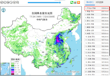 受“杜蘇芮”殘留云系影響,安徽天柱山昨天夜間開(kāi)始出現(xiàn)猛烈降雨,29日08時(shí)-30日08時(shí)的24小時(shí)降水量達(dá)330毫米,達(dá)特大暴雨級(jí)別,是過(guò)去24小時(shí)里全國(guó)降雨最強(qiáng)的國(guó)家站,也是該站點(diǎn)自1949年來(lái)單日降水量第一。